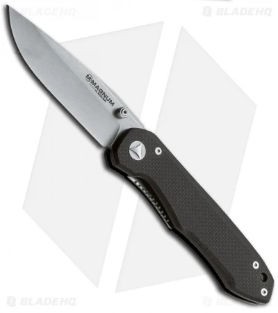 The Boker Magnum X-Over is an impressive design. The blade is 440 stainless steel and has an attractive stonewash finish. Black G10 handle with steel liner lock. Includes pocket clip and lanyard hole.